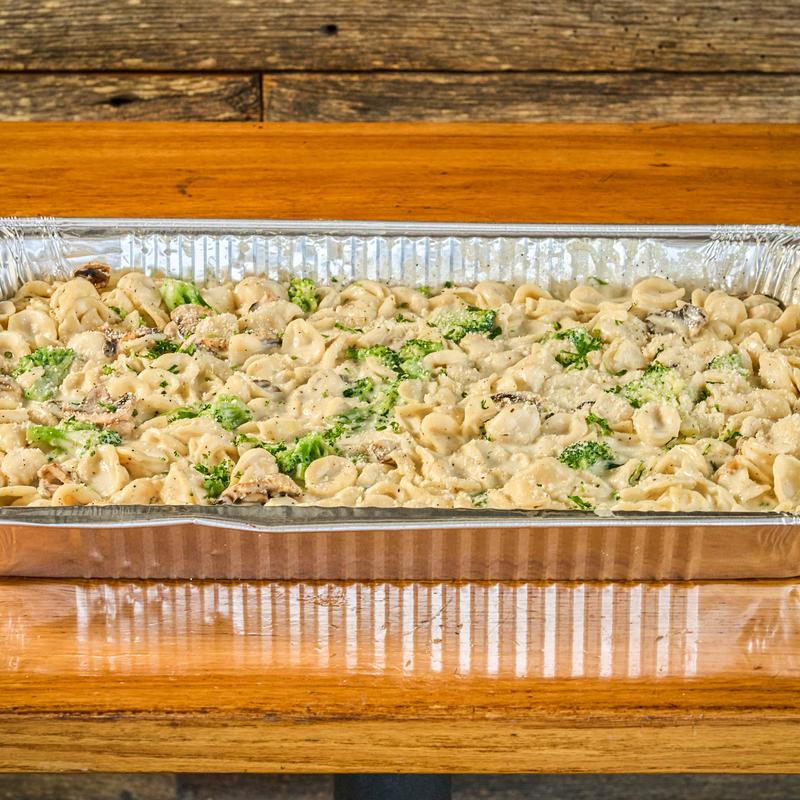 Orecchiette pasta in a Parmigiana cream sauce with broccoli & mushrooms.