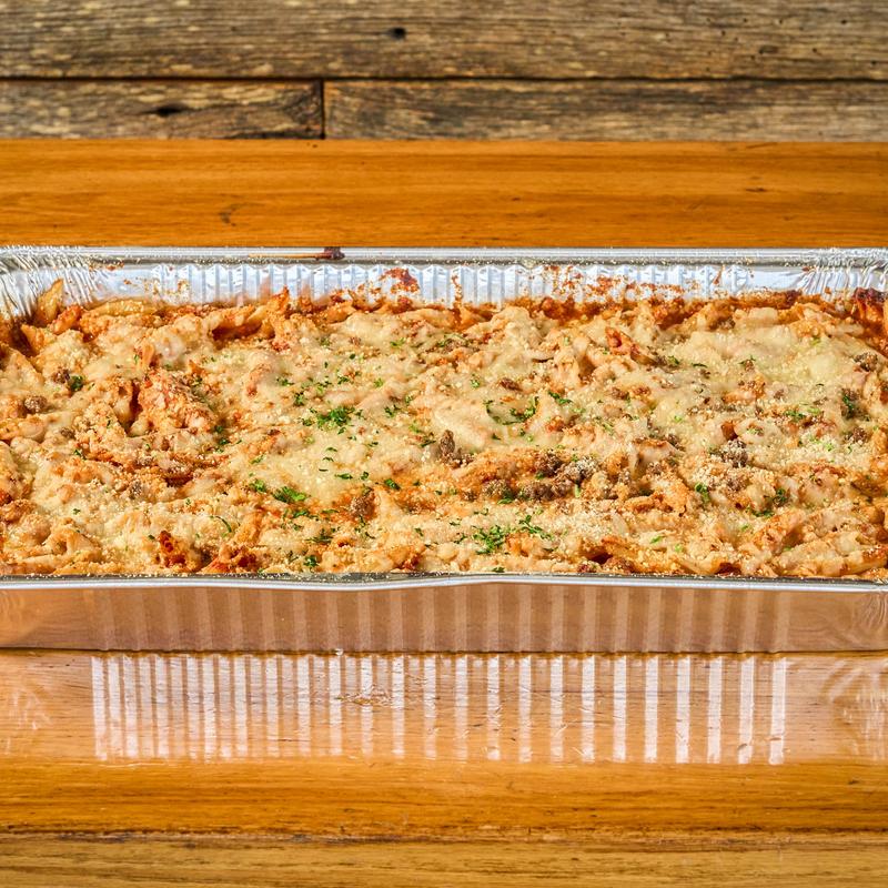 Penne pasta in marinara baked with provolone. Vegetarian or with meat sauce baked with provolone.